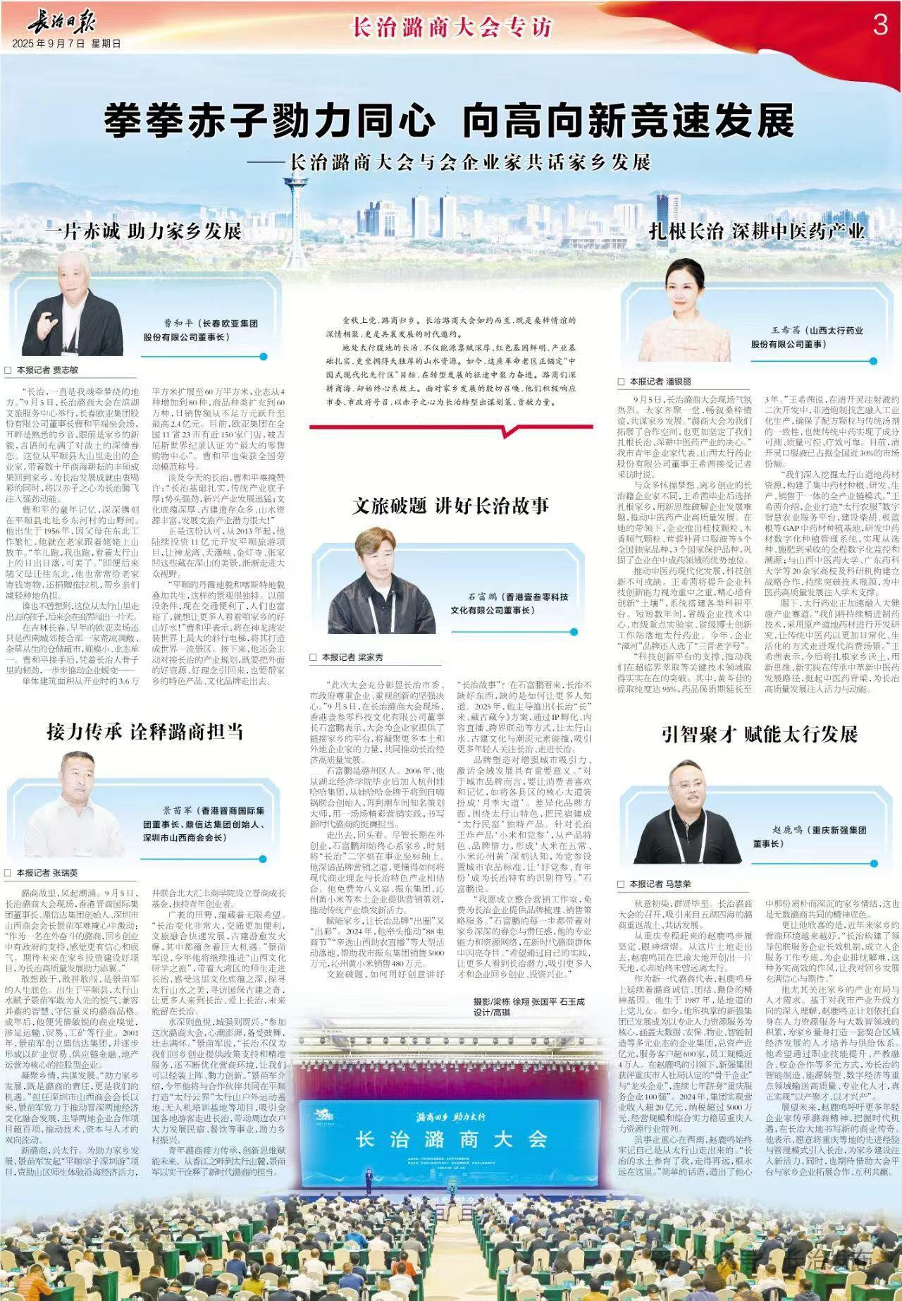 近日,以“拳拳赤子勠力同心,向高向新竞速发展”为核心愿景的全球潞商大会在山西长治召开。这场汇聚海内外潞商的盛会,既是同乡间叙情谊的平台,也是大家共同探讨家乡发展的契机。作为从长治走出的优秀企业家代表,重庆新强集团董事长赵鹿鸣先生受邀参会。期间,赵总与同乡同仁交流家乡发展,其对故土的情感与助力家乡的想法,也被《长治日报》在大会专题报道中以专访形式呈现。